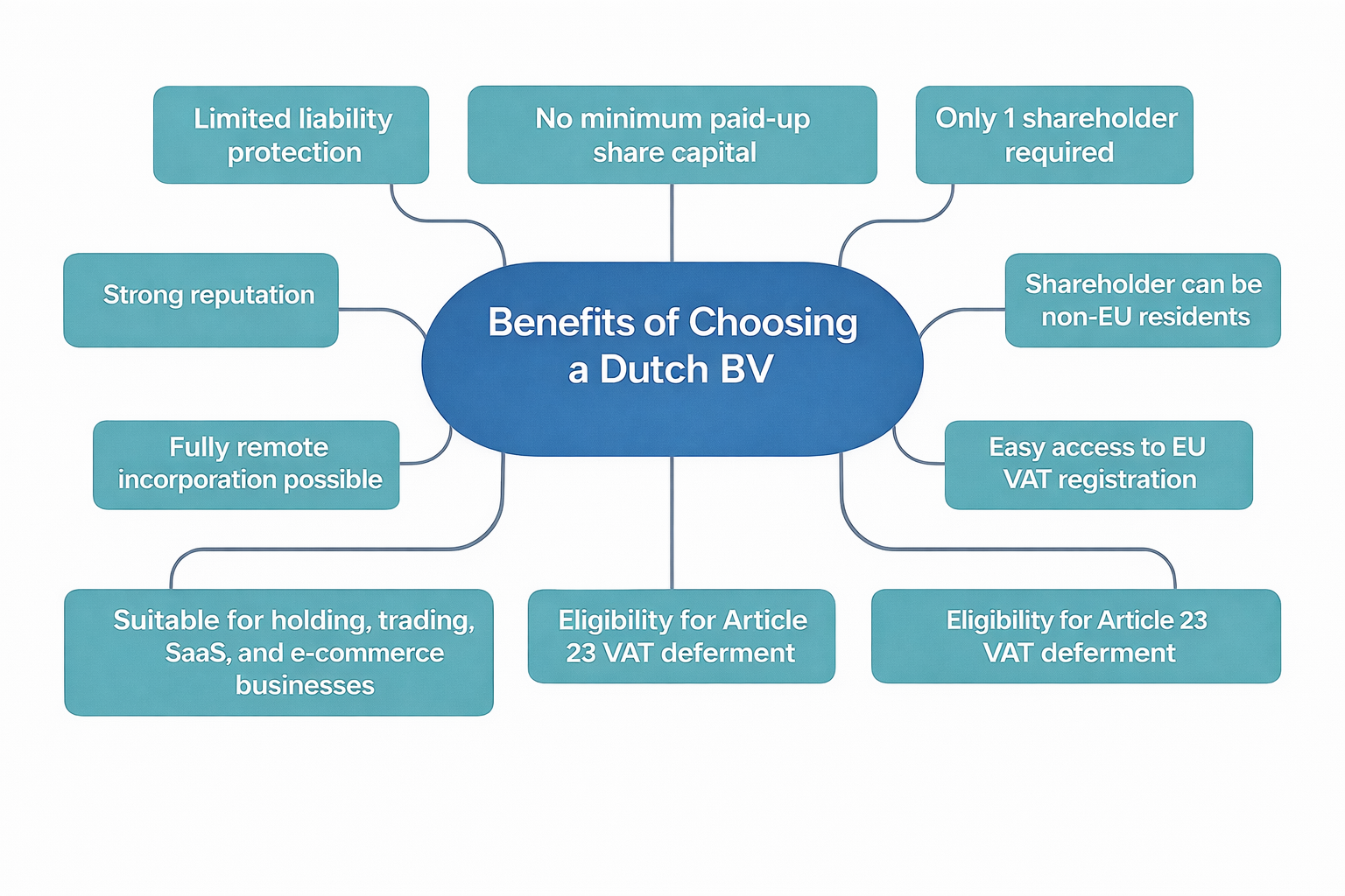 This is why we usually recommend a Dutch BV to founders planning e-commerce, SaaS, import–export, holding structures, or European expansion. It is not just a legal formality — it is a strong operational base for doing business in Europe.